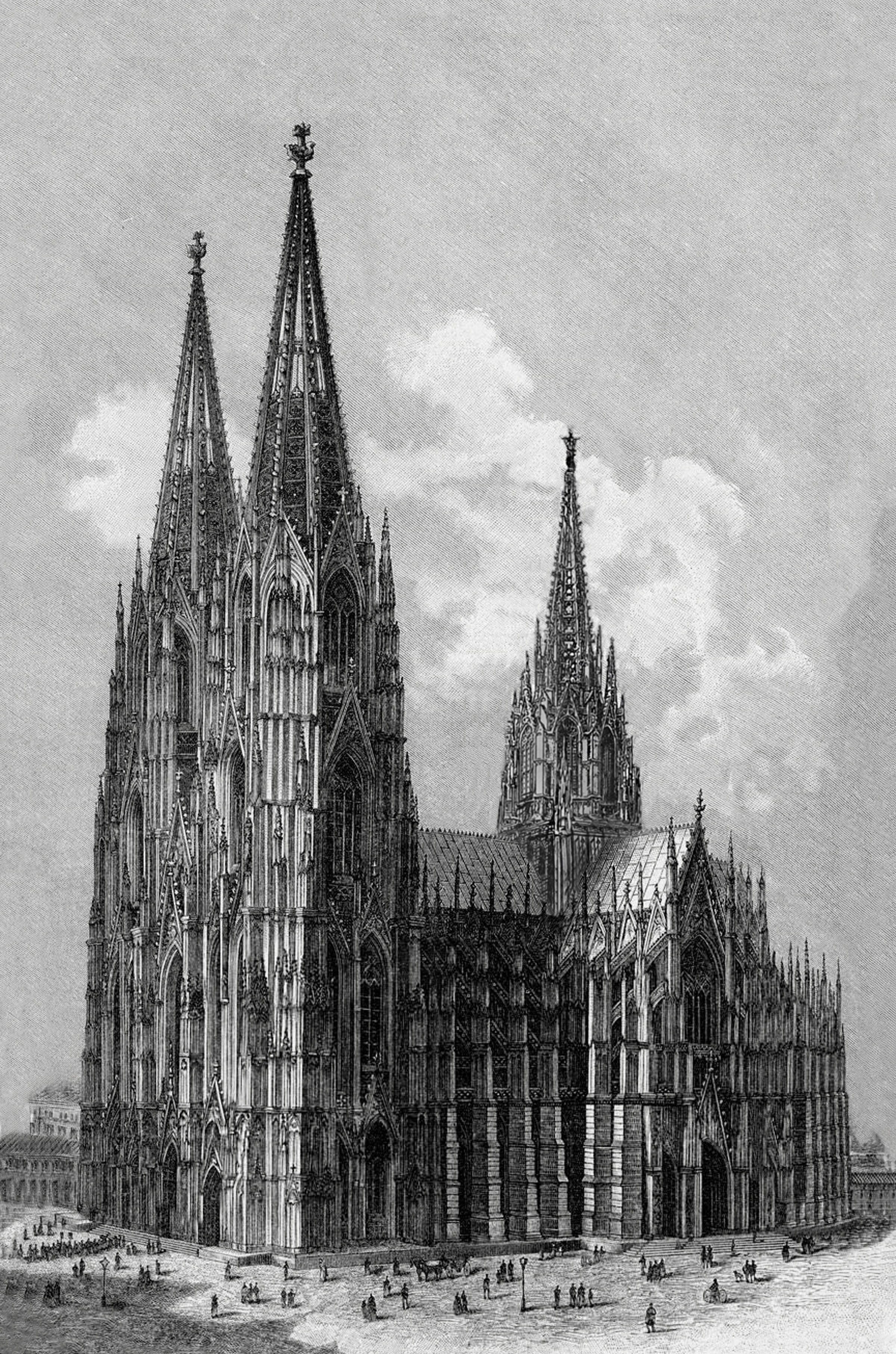 Der weltberühmte Dom St. Peter in Köln stellt den größten und perfektesten Bau des Kathedraltypus, wie er auf der Ile de France entwickelt wurde, dar. Während bei seinem am engsten verwandten französischen Vorbild, der Kathedrale von Amiens auf stark ausgebildete Türme verzichtet wurde und diese eher einer Ausformung der Fassade gleich kommen, wollte man in Köln ganz offensichtlich von Anbeginn eine besonders monumentale Turmfassade, eine wahres gotisches Gebirge an Stein erstellen, dass jedoch lediglich durch den größten je aufgefundenen Planriss des Meisters belegt war. Erst dem romantischen und nationalistischen Geist des 19. Jahrhunderts war es vorbehalten, den im Spätmittelalter nicht mehr vollendeten Dom samt den zwei jeweils 157 Meter hohen Türmen tatsächlich zu vollenden. So weit die Geschichte.