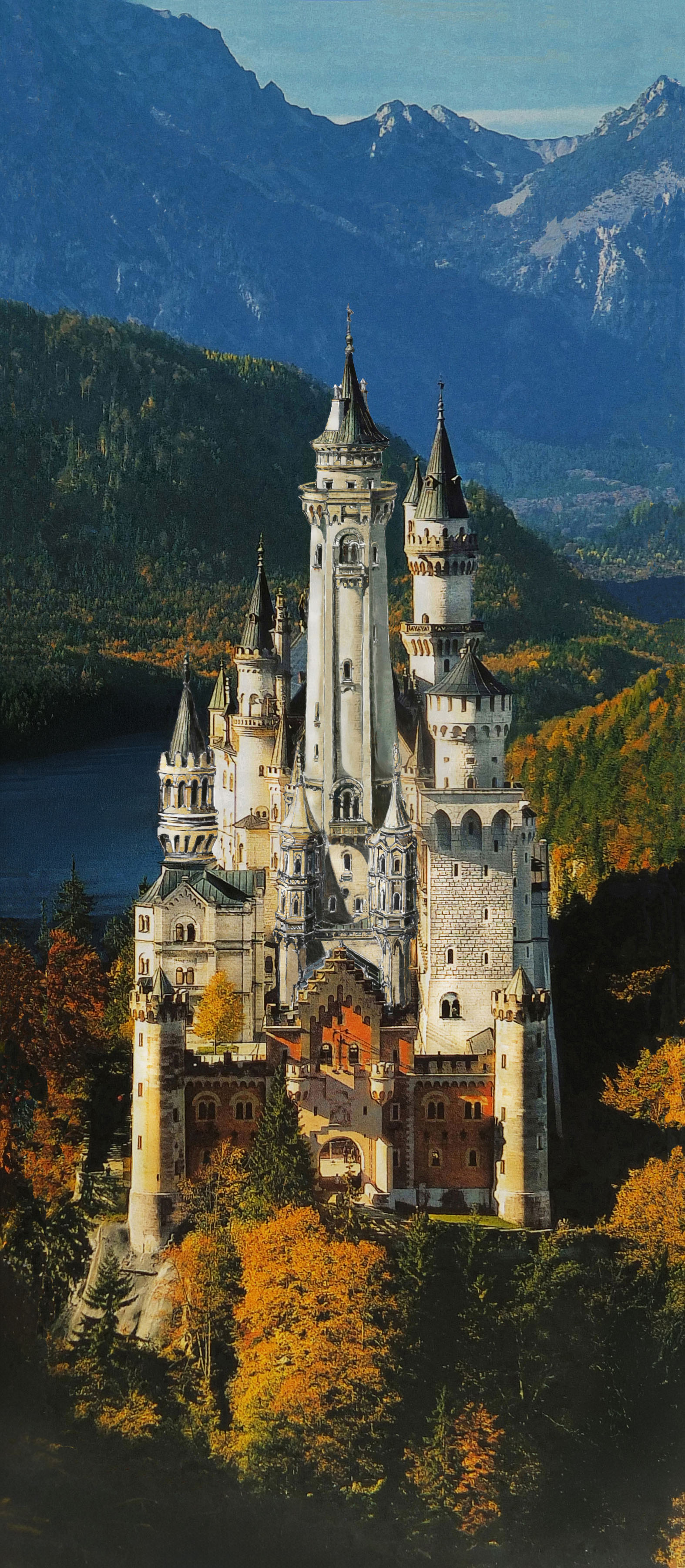Dargestellt wurde die unmittelbar vor dem Tode Ludwigs II. geplante Variante mit dem erwähnten Hauptturm über der Schlosskapelle. Die Verbindung von Kapelle und Burgturm ist ein besonderes Motiv des mittelalterlichen Burgenbaus, der vor allem den kaiserlichen Bauten vorbehalten war. Man findet solche seltenen Anlagen bei der Stauferburg in Trifels, der Nürnberger Burg oder der Burg Karlstein bei Prag.