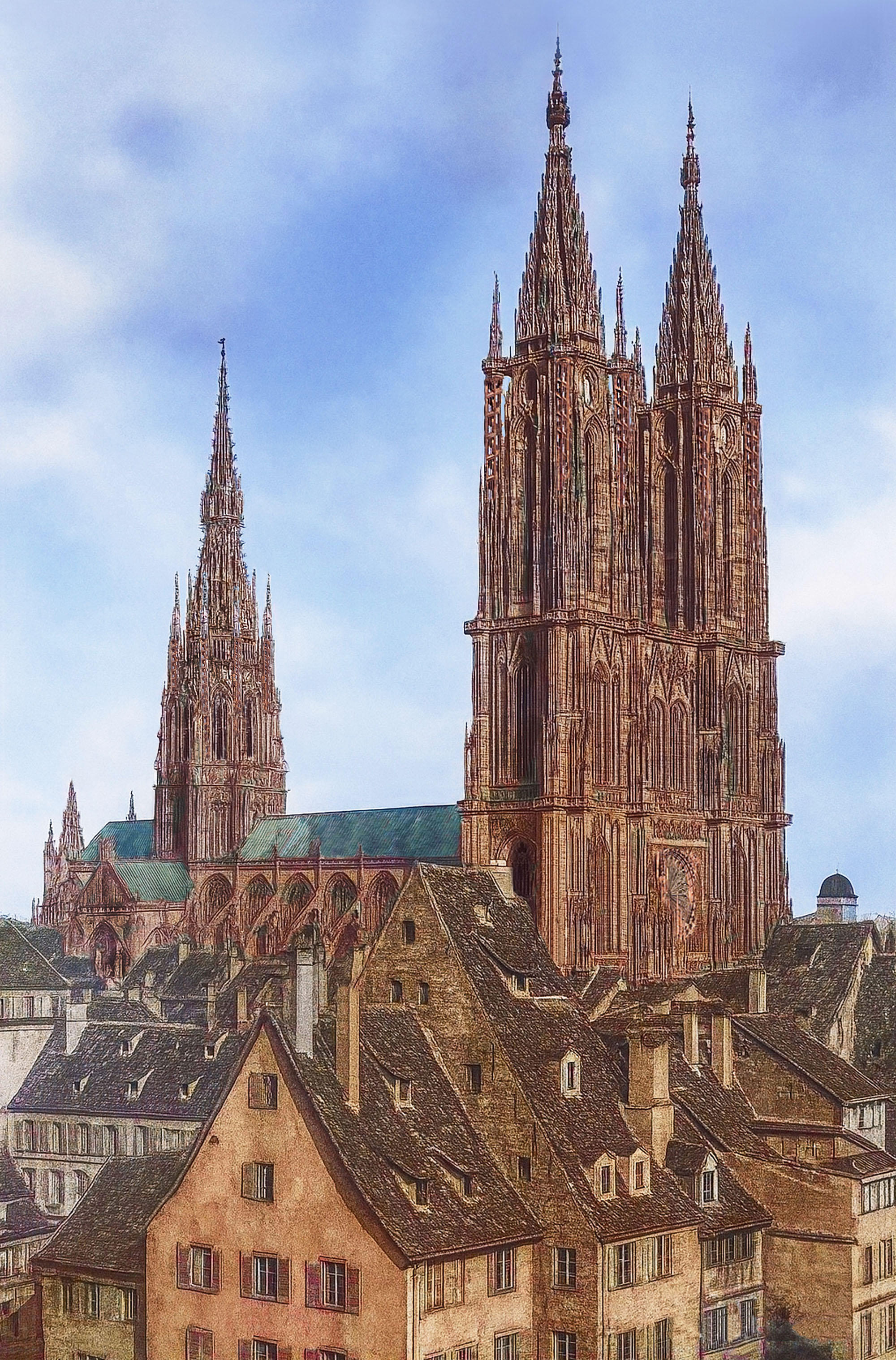 Verfolgt man jedoch Planungen späterer Phasen, hätte hier ein sehr imposantes und weit einheitlicheres Gebilde entstehen können. Reduziert man den Einturm und ebenso das Glockengeschoss zwischen den Türmen, ließe sich in Gedanken tatsächlich eine harmonische Turmfassade entwickeln, der dann die Rekonstruktionsvorschläge von Friedrich Adler zu Grunde liegen. Die gotisch nicht weiter ausgeformte Vierung und der spärliche unzureichende Chor hätten mit Sicherheit durch aufwändiges Neues ersetzt werden sollen. Planungen, die im Frauenhaus in Straßburg aufbewahrt werden, zeigen das Mögliche: ein an die Vierung anschließendes, riesiges fünfschiffiges Langhaus mit fünfschiffiger Halle und seitlichen niedrigen Schiffen im Anschluss, sowie einen mächtigen, dreischiffigen Hallenumgangschor mit Kapellenkranz. So ist es in meinem Entwurf eingefügt. Da das nun immens vergrößerte Kirchenschiff eine Höhendominante erfordert, bot es sich an, den alten romanischen Vierungsturm durch einen neuen, höheren gotischen Turm, zu ersetzen. Die alten romanischen Pfeiler wären dazu durchaus in der Lage gewesen. Der neue Turm trägt eine steinerne, achteckige, nach dem romanischen Vorbild gestaltete Laterne, über der sich ein sehr hoher hölzerner Turmhelm erhebt. Die grandiose Gesamtidee zeigt sich in der gewählten Perspektive besonders eindrucksvoll.